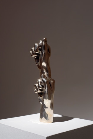 That idea becomes all the more complex when it comes to Weinstein’'s paintings and sculptures. Working with airbrush, precision stenciling and paintbrushes, his canvases often spring from the digital environments he creates for his animated works. Created analytically, by examining the output from the computer in minute detail, Weinstein is able to analyze reflectivity and surface and translate these phenomena into painted works often using airbrush techniques, precision stenciling and paintbrushes. The result has all the pristine gloss of his animations but in three dimensions. However, they are not meant as metonymic subjects isolated from his narrative works, or even representation of those narratives, as in say the sculptures of Matthew Barney or Disney merchandising. They are simply further iterations of Weinstein'’s interest in mirroring, which in itself has obvious connotations for cinema and a long and rich history within the history of painting. As Rosalind Krauss writes, the idea of the mirror within classical painting “freezes and locks the self into the space of its own reduplicated being; flowing and freezing; mirror and ice; transparency, opacity and water. In the associative symbolist thought this liquidity points to a direction, first toward the flow of birth and then towards the freezing stasis or death… This is a multi-level representation through which the work of art can allude and even reconstitute the forms of being.”