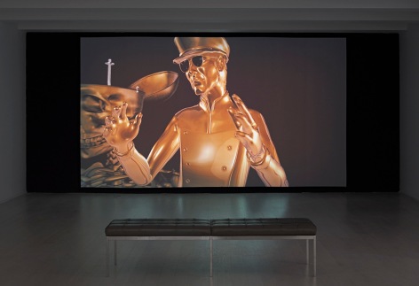 Weinstein often follows in a similar vein, where a character might talk or sing to the viewer as if he or she was in the same room. What’'s more, like Brecht, he understands that the term ‘burlesque’ comes from the French term for ‘gross imitation’ (circa 1660), which is to say that he often incorporates ideas of mimicry, imitation and reflection in his work (which extends to his paintings and sculptures.) Mirrors and pristine surfaces can be found repeatedly, often leading to double and quadruple images at the same time. But he also uses a form of doubling where characters lead to similar characters from one work to the next, or he uses a multitude of references to create an echo of ideas within the work itself. In the video Chariots of the Gods (2009), for instance, the lead character, a metallic fish, exists in what looks like a staged movie set with flats and flyaway walls. But at one point the background becomes foreground as the set morphs into the famous eatery in Alfred Hitchcock'’s Vertigo (a film that is also about the psychological effects of mimicry). Yet the set in Hitchcock’s film was actually a replica of Ernie’'s restaurant in San Francisco, which was created on a film set. Thus Weinstein’'s copy is a copy of a copy and so on.