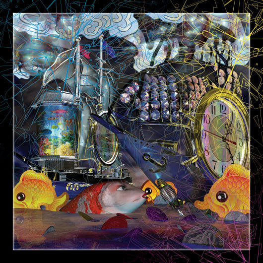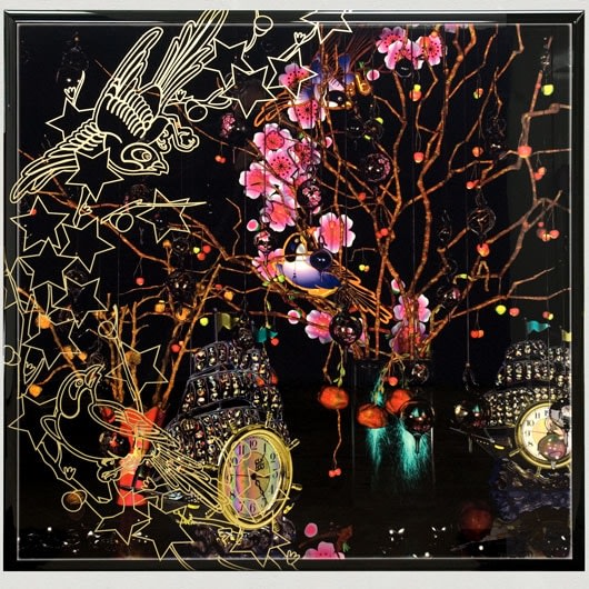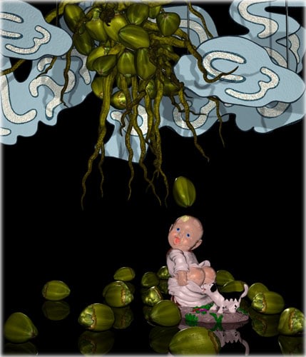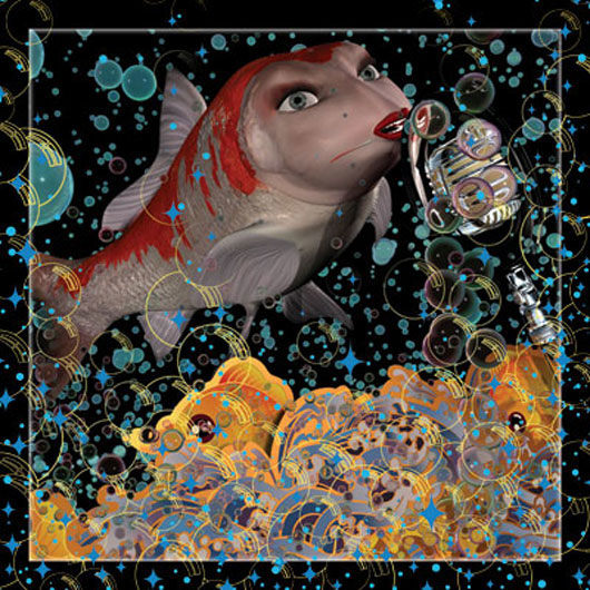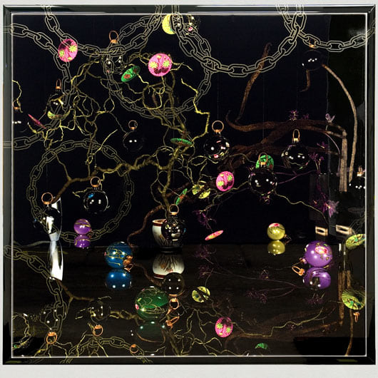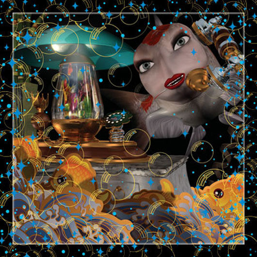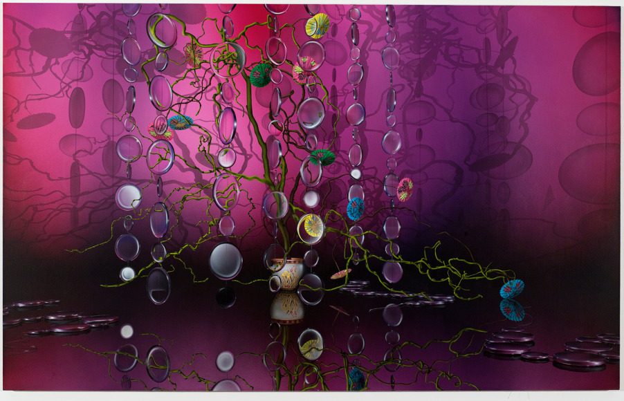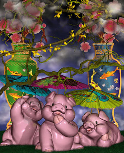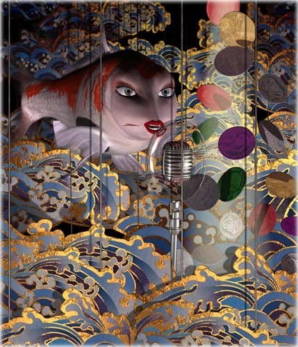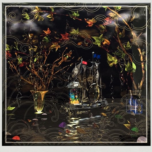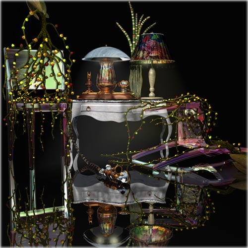 These are the first pieces created by Weinstein in which the imagery is created using a 3D computer animation program. Weinstein began by commissioning Ikebana arrangements and then re creating them in virtual space. The images were then printed onto wood and hand lacquered and edged to resemble Japanese lacquer. As the pieces progressed, Weinstein departed from the Ikebana arrangements and began to insert narrative elements; the arrangement overturned or invading a domestic space. These pieces then began to feature the animated characters from Weinstein's films. The essay below was written by Weinstein for an exhibition catalogue to accompany a show at the Baldwin Gallery in Aspen, CO. These renderings appear in several of Weinstein's paintings as well as in his animated film, 'Bolero.'
