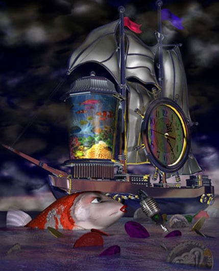 I never studied art formally. I tried numerous classes in life drawing, but had absolutely no aptitude for it. They say that dyslexia causes one to think spatially in three dimensions, and they also say that it causes one to flatten out the world. I have no idea which theory describes the condition. I was dyslexic and I couldn't foreshorten to save my life. I couldn't draw, and I didn't.I started to notice 3-D imaging. Max Headroom was a real actor impersonating a computer-generated head. 3-D technology in 1984 was not capable of really generating Max. But, as usual, technology catches up with science fiction. Cartooning was obviously changing. The moving comic book had mated with the virtual reality experience with some help from military technology and became Toy Story. Finally, 3-D programs were available for regular computers, and people with no knowledge of programming could use these programs. The learning curve was, and still is, incredibly steep for these programs, but I was completely sucked in the first time I saw objects that were drawn in a simulation of three dimensional space, and could be moved around, lit and textured in this space. The computer screen was no longer a window being looked through; it became a window I was flying through. I could see this virtual 3-D space more clearly then I could see 'natural' space. My brain liked it in there better. My computer was calculating the impossibility of reconciling three dimensional and flat spaces for me. 3-D technology fulfilled my dream of acquiring the academic proficiency in drawing that I was never even remotely able to attain in a traditional drawing class.