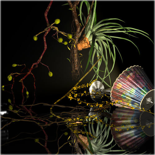 I put the arrangement next to my computer. Over the next three weeks, I modeled and textured every piece of this arrangement and rebuilt it in virtual three-dimensional space. No photography, just vectors and texture maps. It was still life painting without paint, without a surface, and without actual coordinates in the physical world. When this piece was done, I had Junko come back again and again to make more arrangements until I had a series of Ikebana pieces.