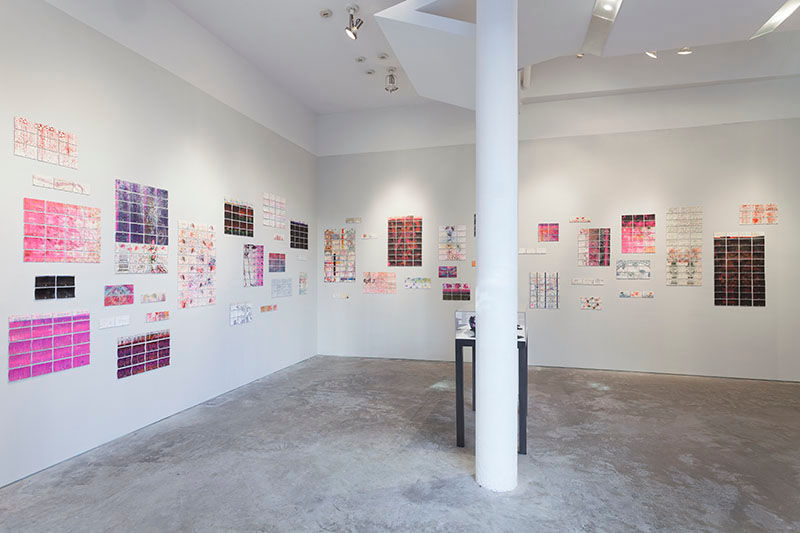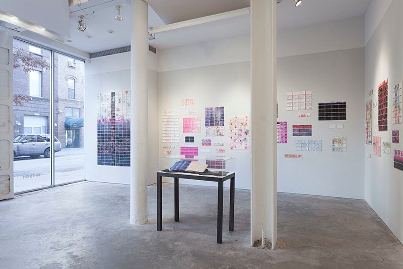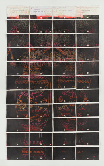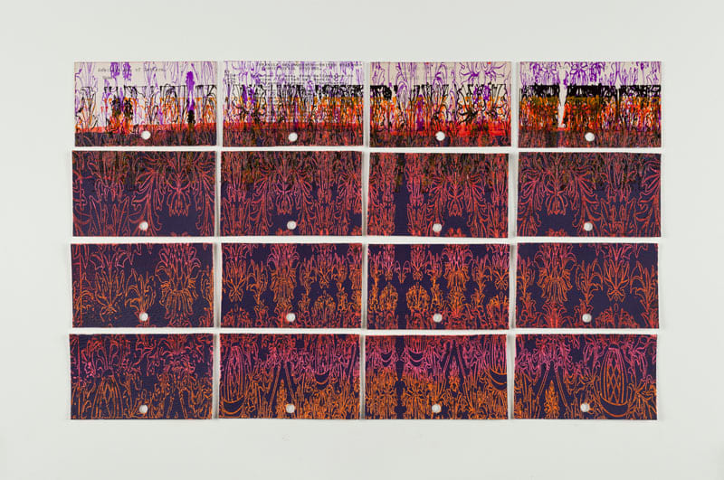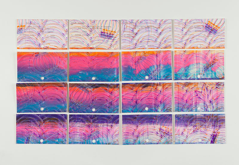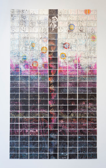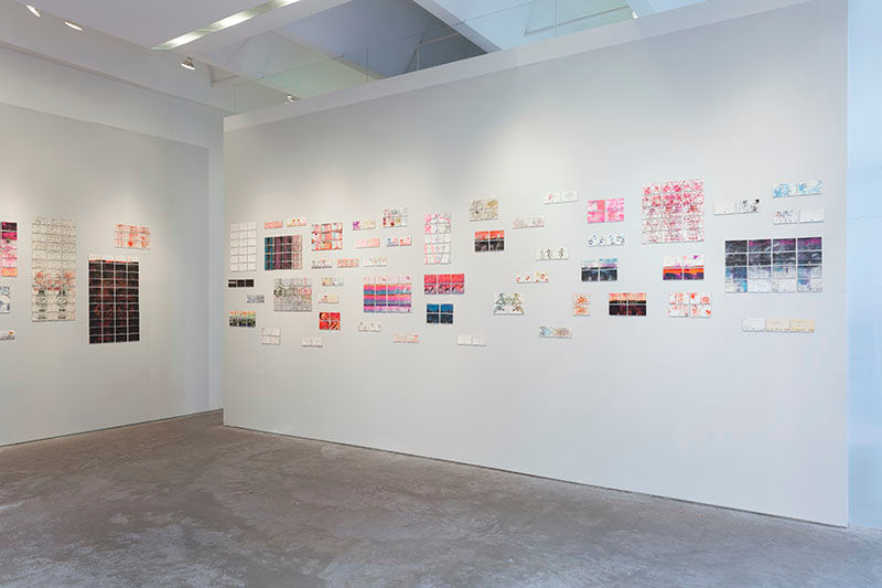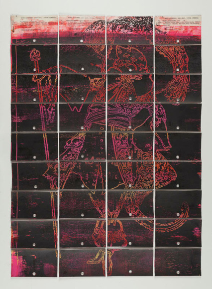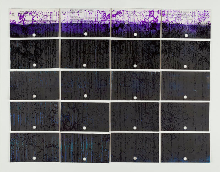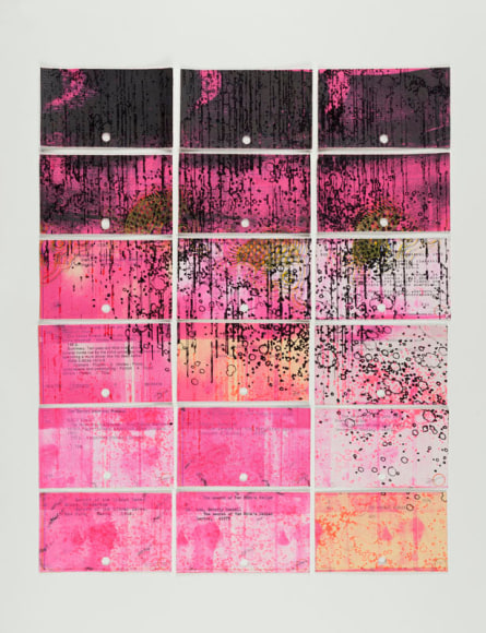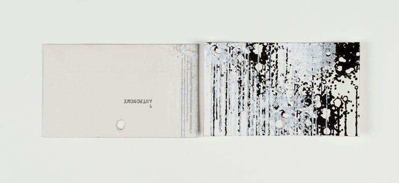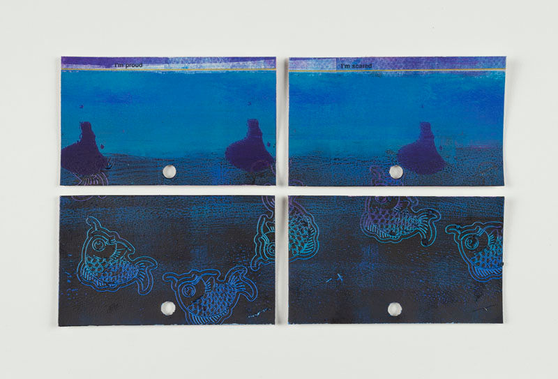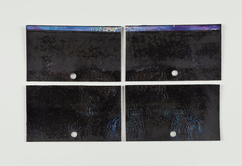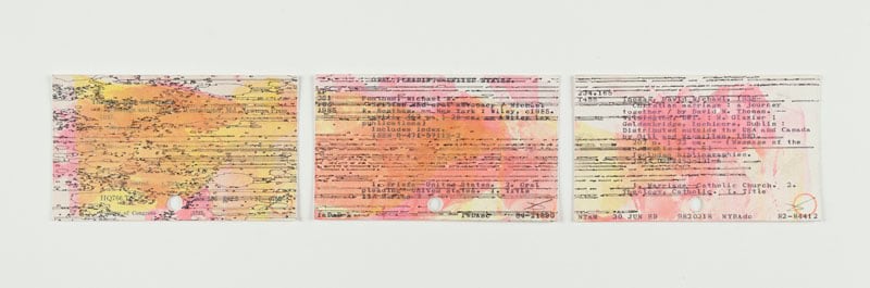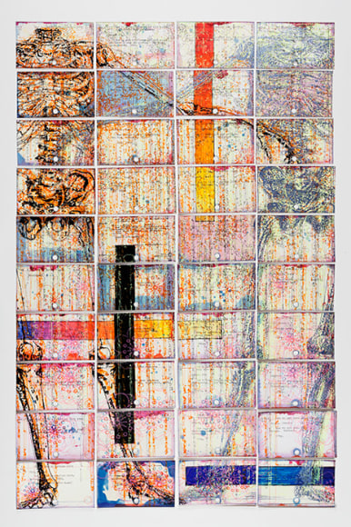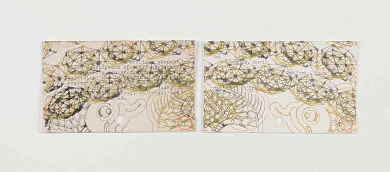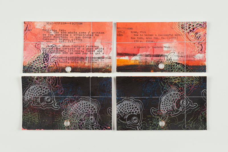 Weinstein's catalog cards are configured as pairs and larger groups, arranged on an underlying grid which provides a structural network for the work. Unique bookworks comprised of small groupings of these cards will also be on view. The imagery is sometimes contained to individual cards, but often spills from one card to the next creating a complex tiled work. The overlaid images are iconographic figures and objects, such as fish and skeletons, common throughout much of Weinstein's work.