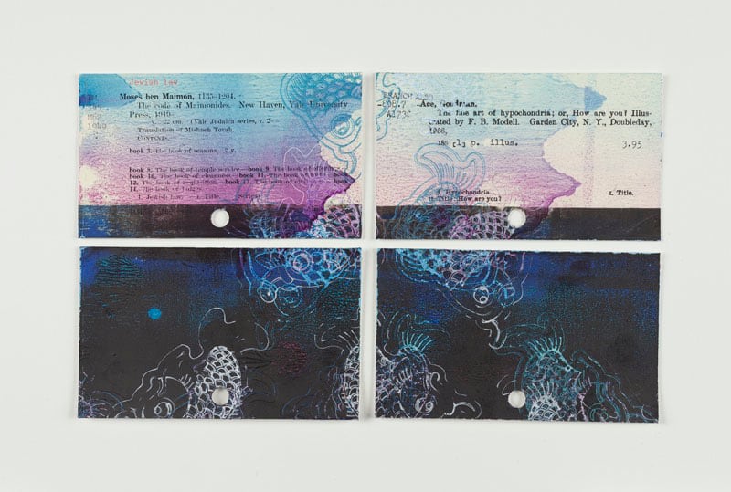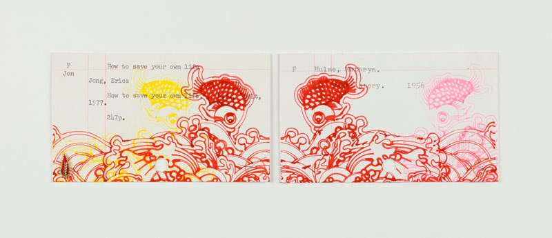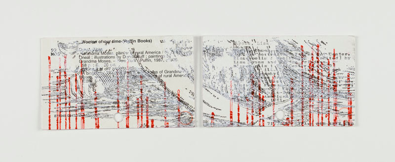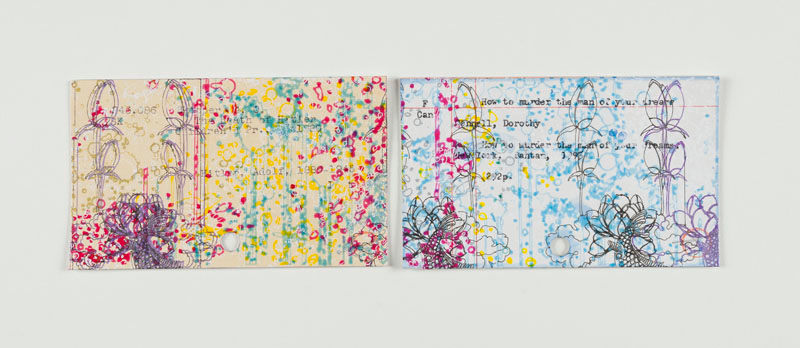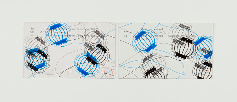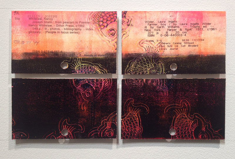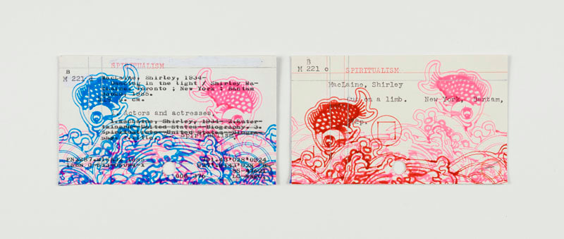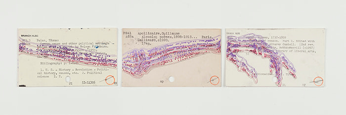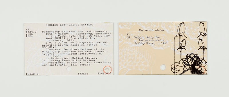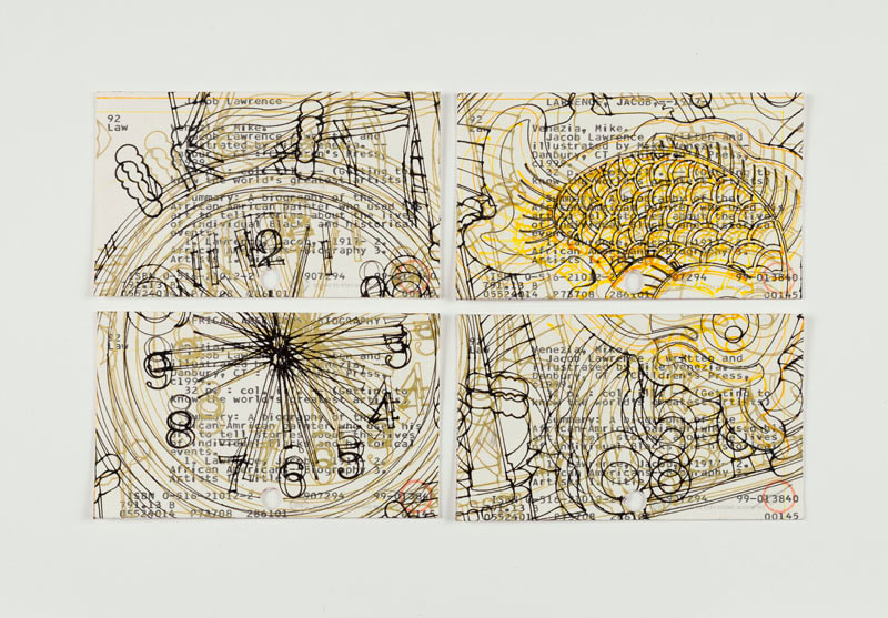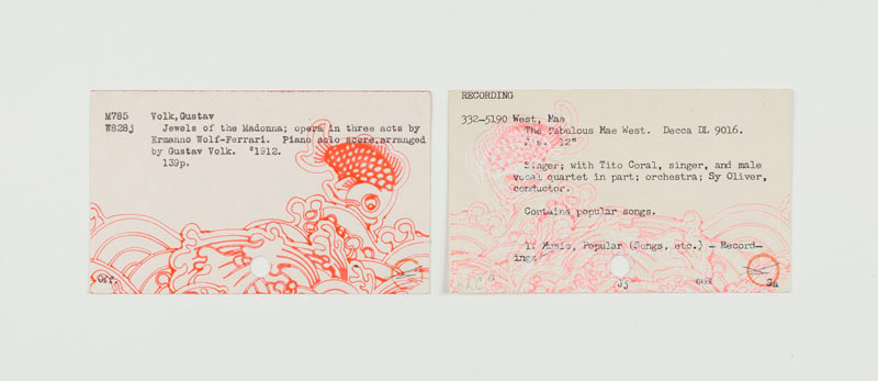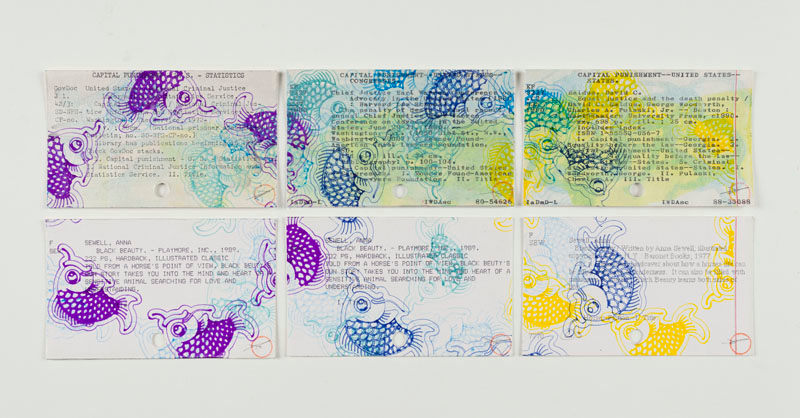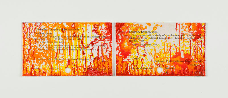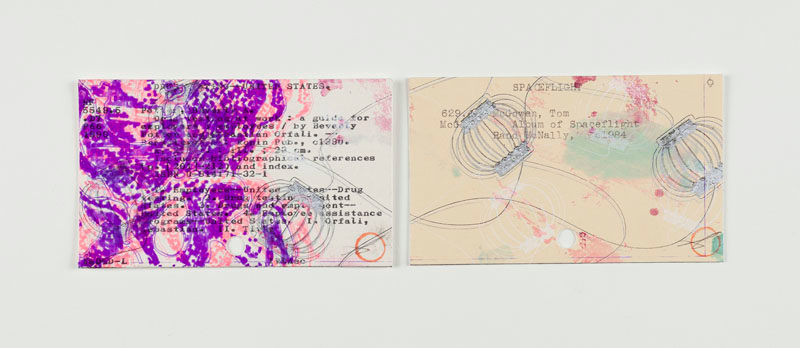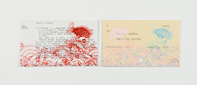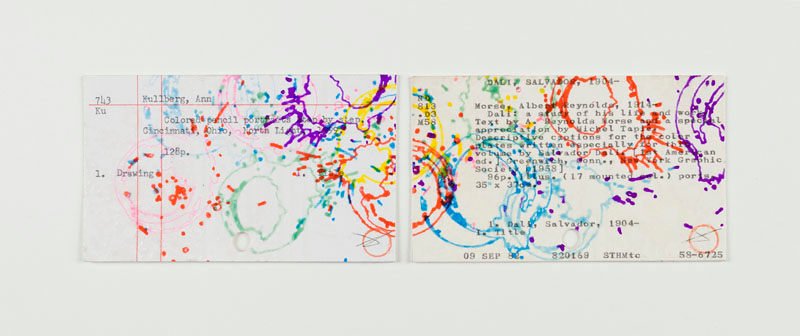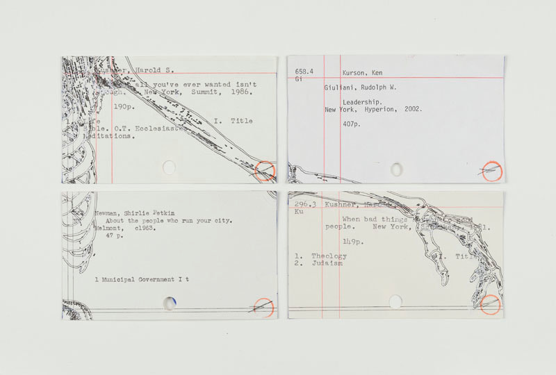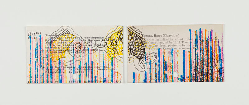 Weinstein began acquiring piles of these cards from ebay. They arrived from different locations around the country, from different decades, and from different types of libraries specializing in different types of books. Hand annotated by librarians and smudged by generations of index fingers, they each carried their own history. Weinstein began randomly selecting them from different piles. Patterns, puns, jokes and coincidences occurred that spanned location, subject and time; a dada poetry emerged. Then he began to draw and print on them, using images from his own repertoire that have no direct relation to the subjects of the cards, and an abstract narrative emerged, one nudged along but never pushed.
