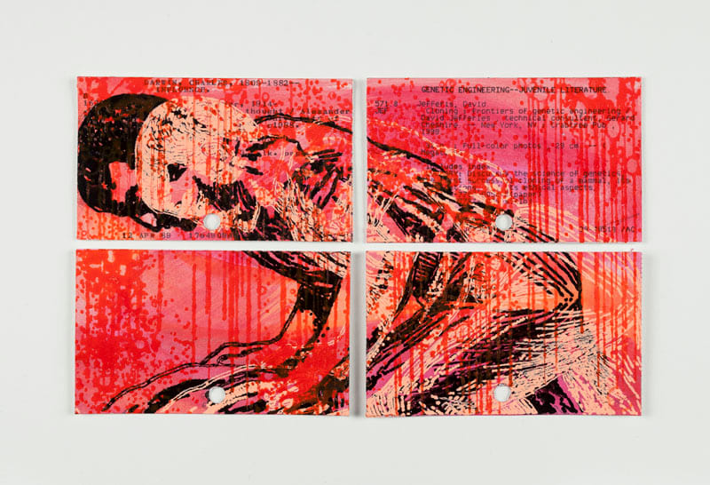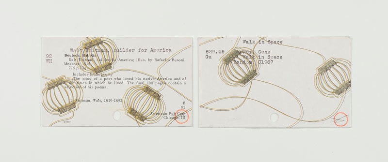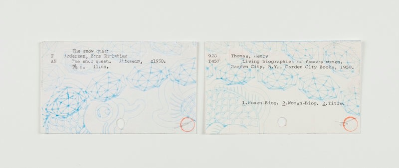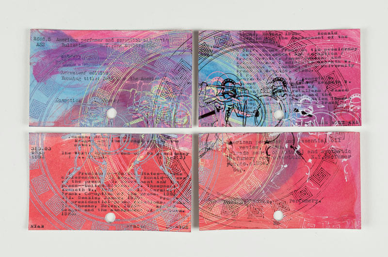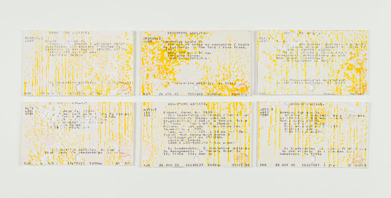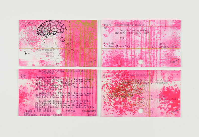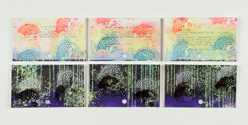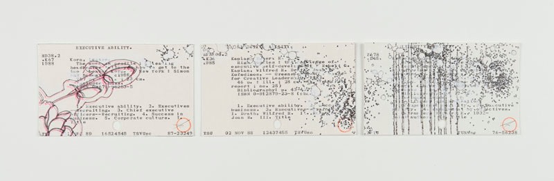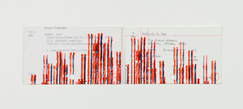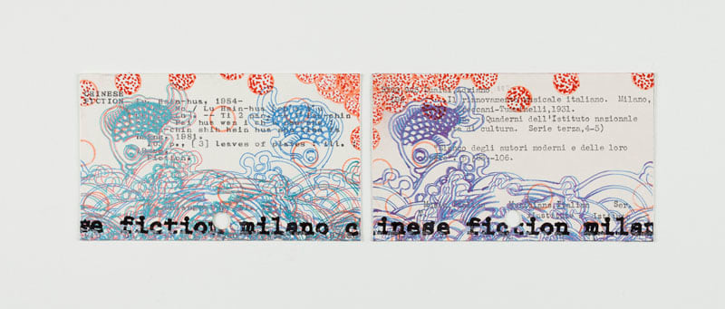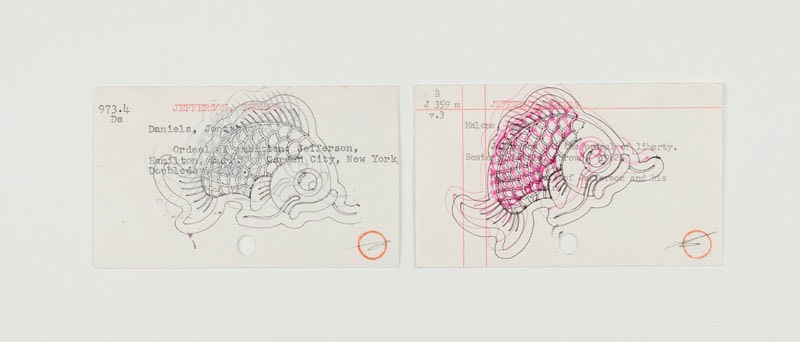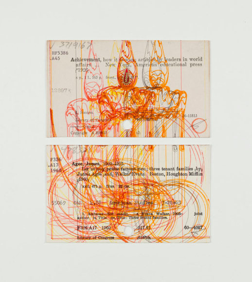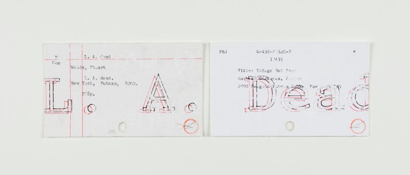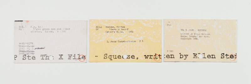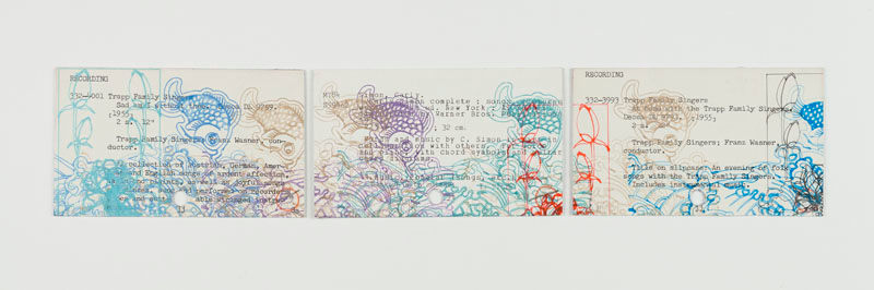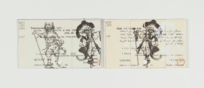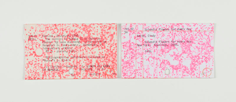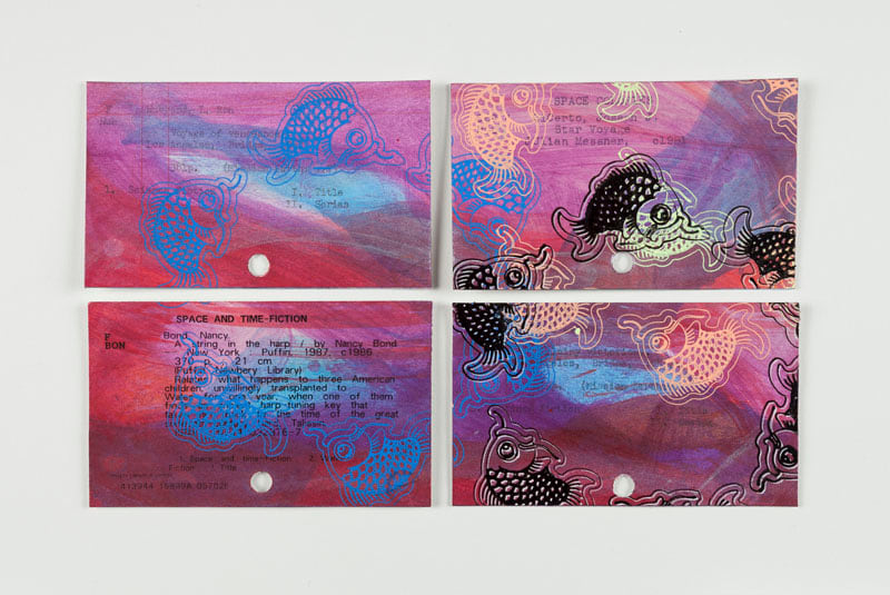 Weinstein began acquiring piles of these cards from ebay. They arrived from different locations around the country, from different decades, and from different types of libraries specializing in different types of books. Hand annotated by librarians and smudged by generations of index fingers, they each carried their own history. Weinstein began randomly selecting them from different piles. Patterns, puns, jokes and coincidences occurred that spanned location, subject and time; a dada poetry emerged. Then he began to draw and print on them, using images from his own repertoire that have no direct relation to the subjects of the cards, and an abstract narrative emerged, one nudged along but never pushed.
