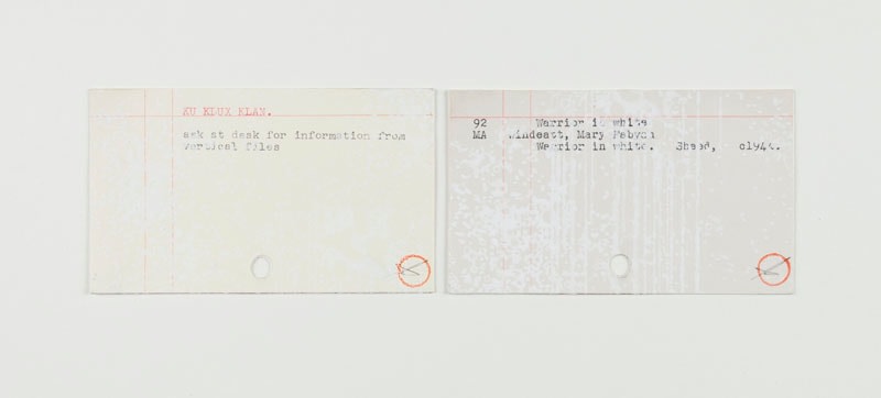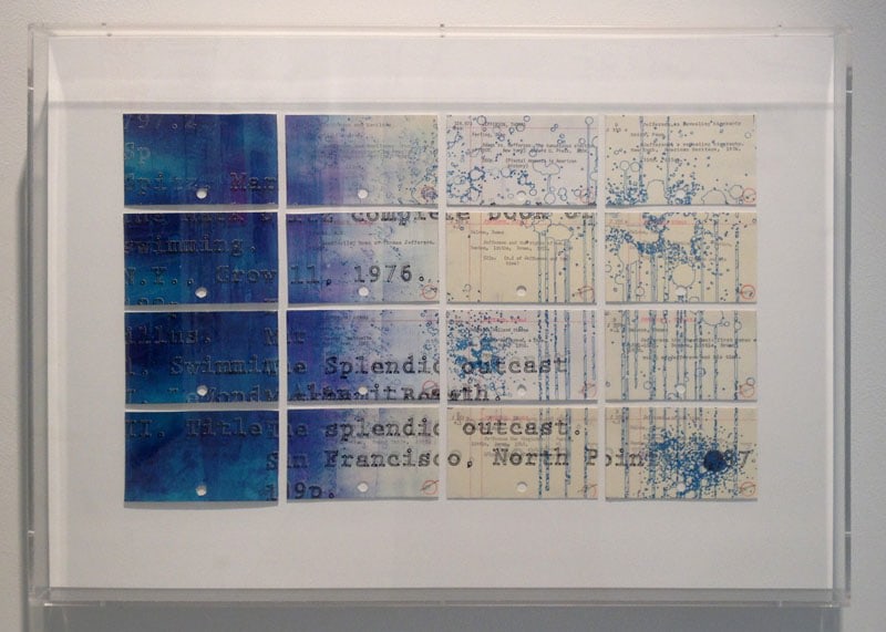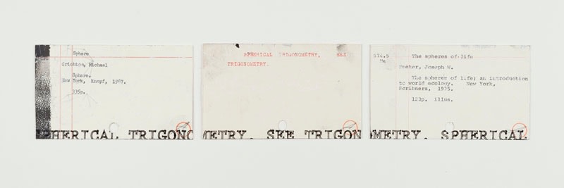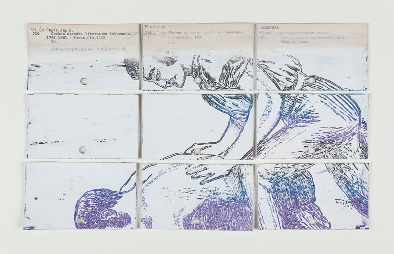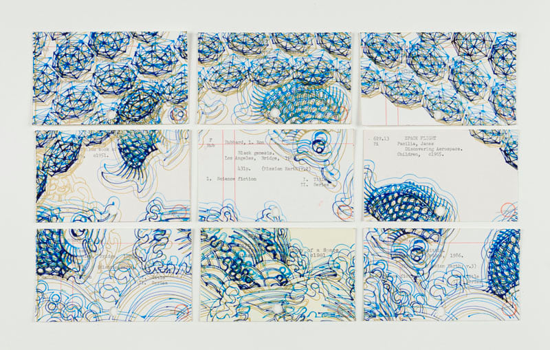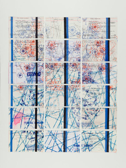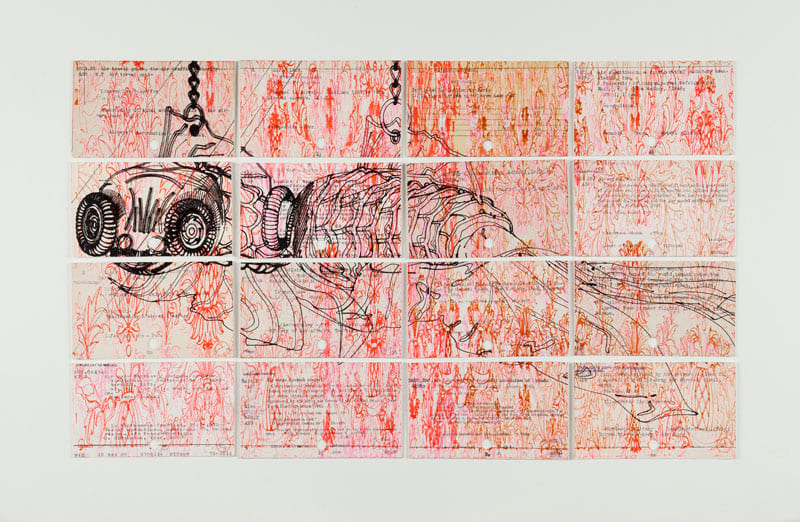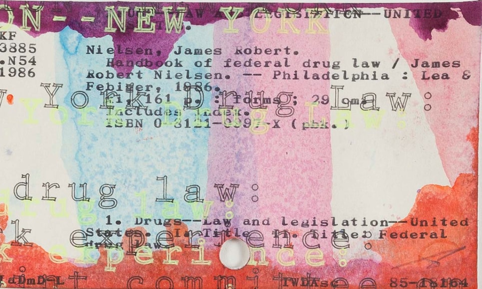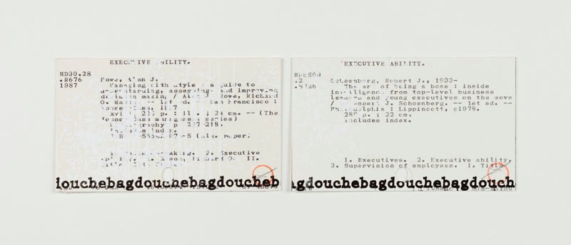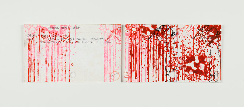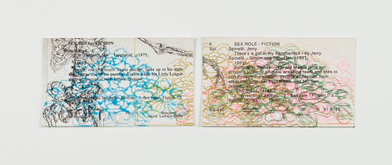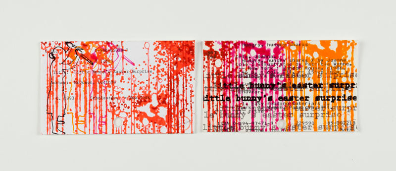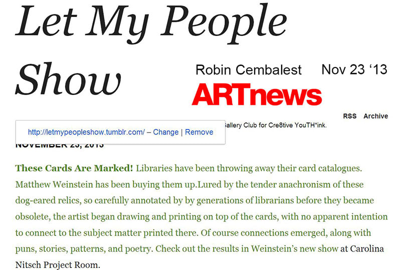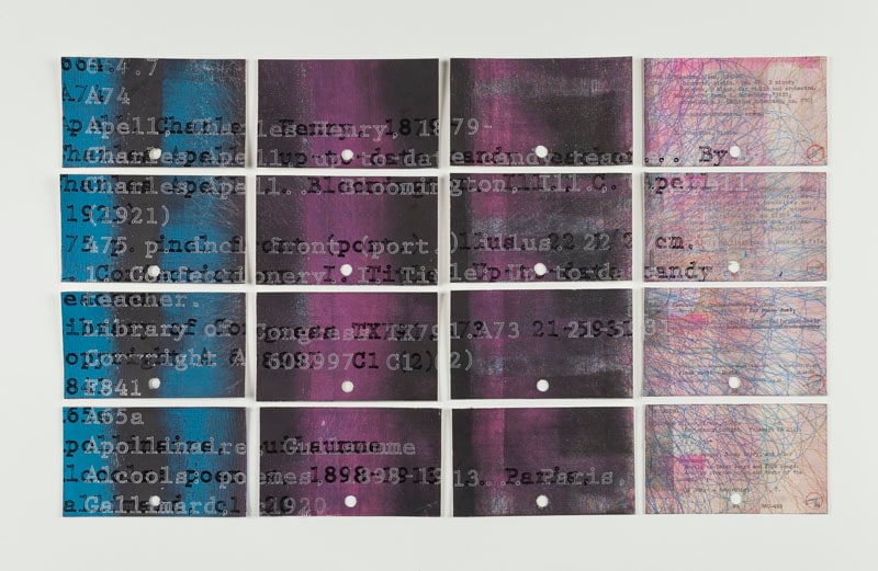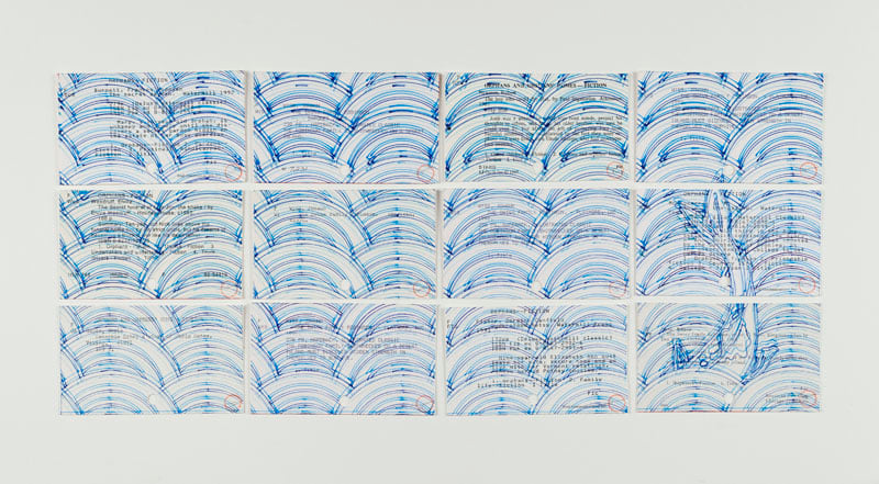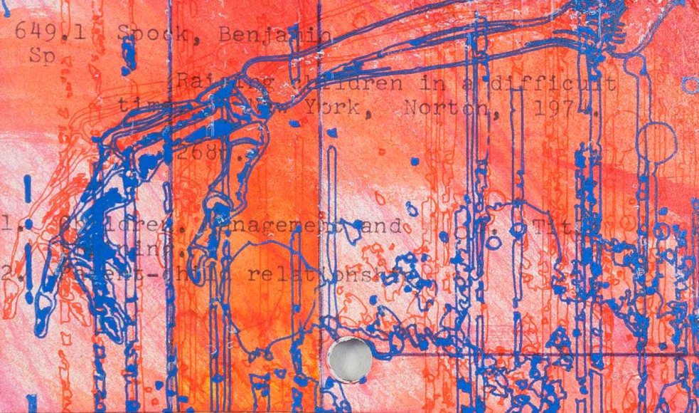 Weinstein began acquiring piles of these cards from ebay. They arrived from different locations around the country, from different decades, and from different types of libraries specializing in different types of books. Hand annotated by librarians and smudged by generations of index fingers, they each carried their own history. Weinstein began randomly selecting them from different piles. Patterns, puns, jokes and coincidences occurred that spanned location, subject and time; a dada poetry emerged. Then he began to draw and print on them, using images from his own repertoire that have no direct relation to the subjects of the cards, and an abstract narrative emerged, one nudged along but never pushed.