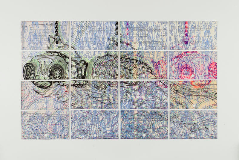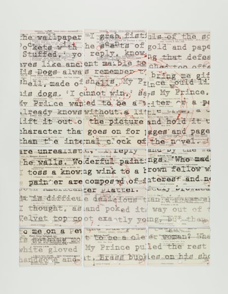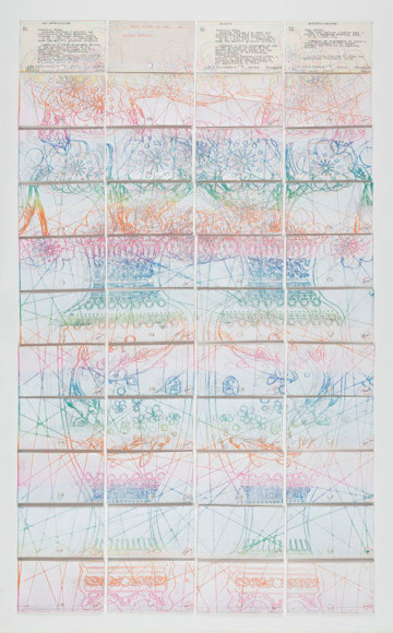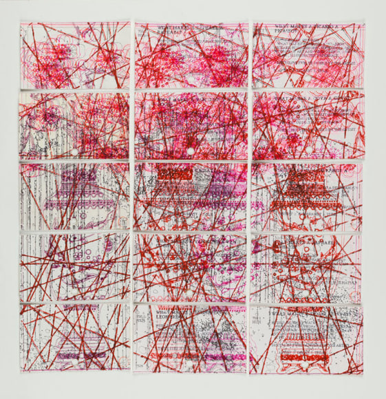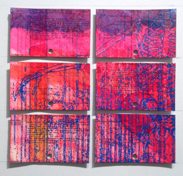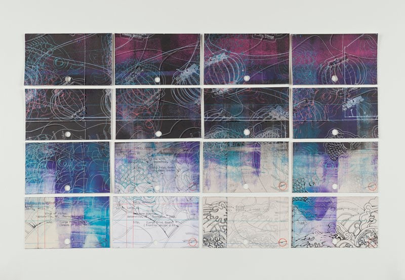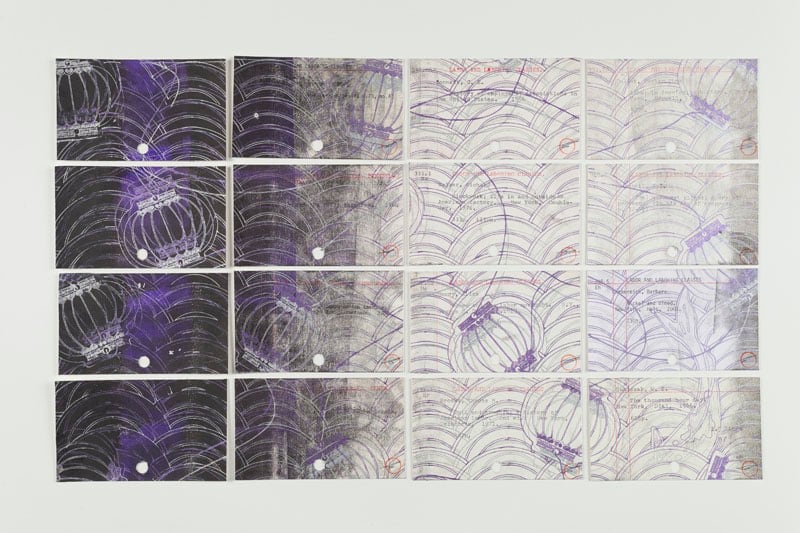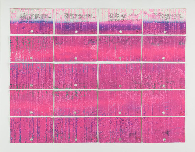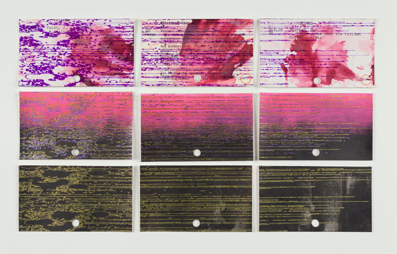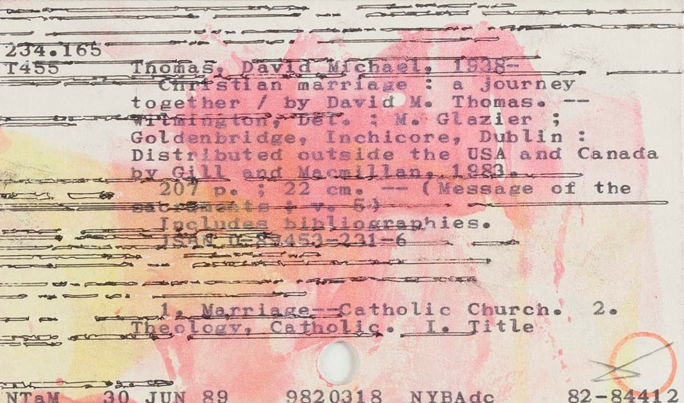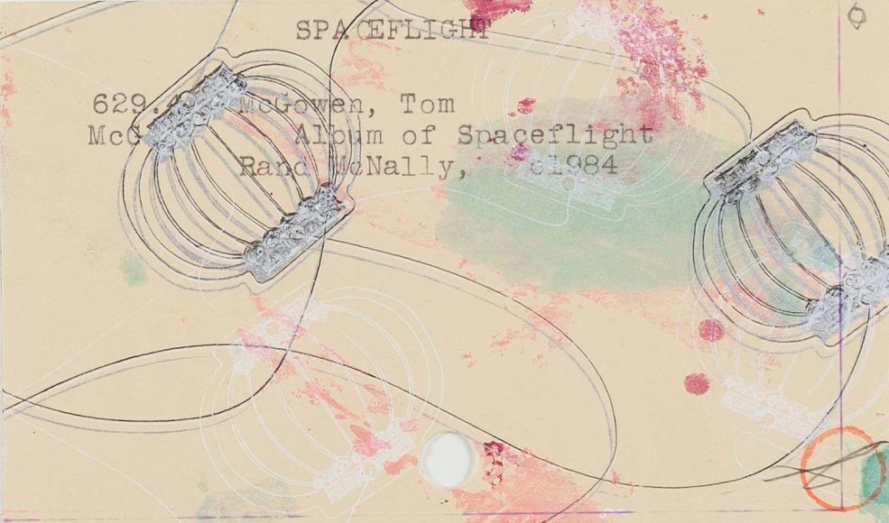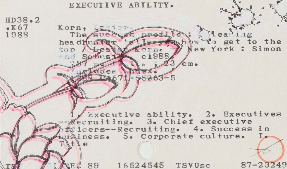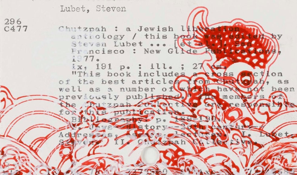 Weinstein began acquiring piles of these cards from ebay. They arrived from different locations around the country, from different decades, and from different types of libraries specializing in different types of books. Hand annotated by librarians and smudged by generations of index fingers, they each carried their own history. Weinstein began randomly selecting them from different piles. Patterns, puns, jokes and coincidences occurred that spanned location, subject and time; a dada poetry emerged. Then he began to draw and print on them, using images from his own repertoire that have no direct relation to the subjects of the cards, and an abstract narrative emerged, one nudged along but never pushed.