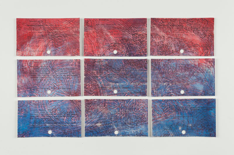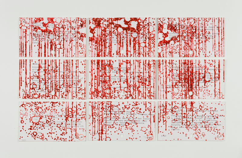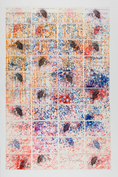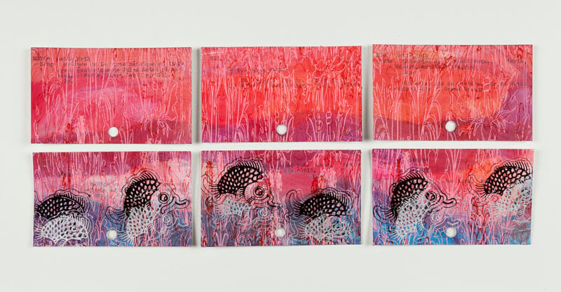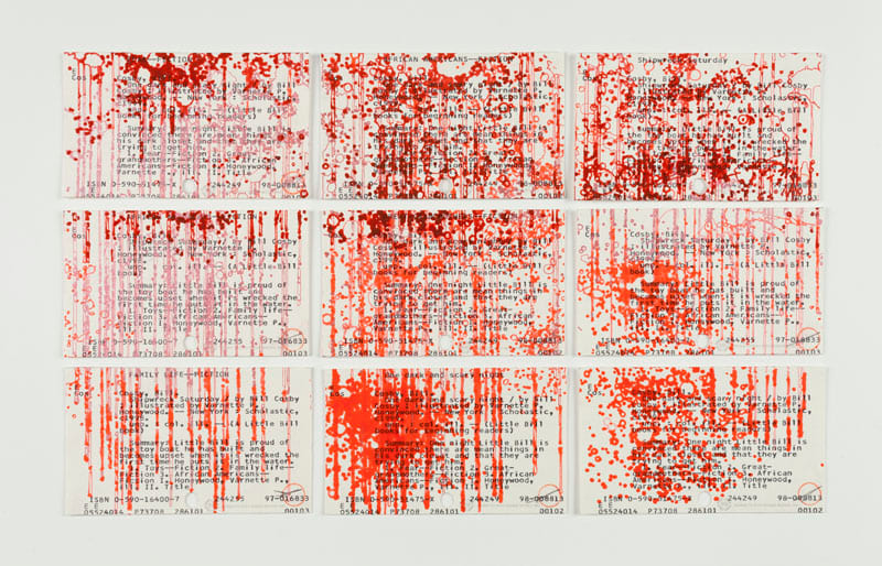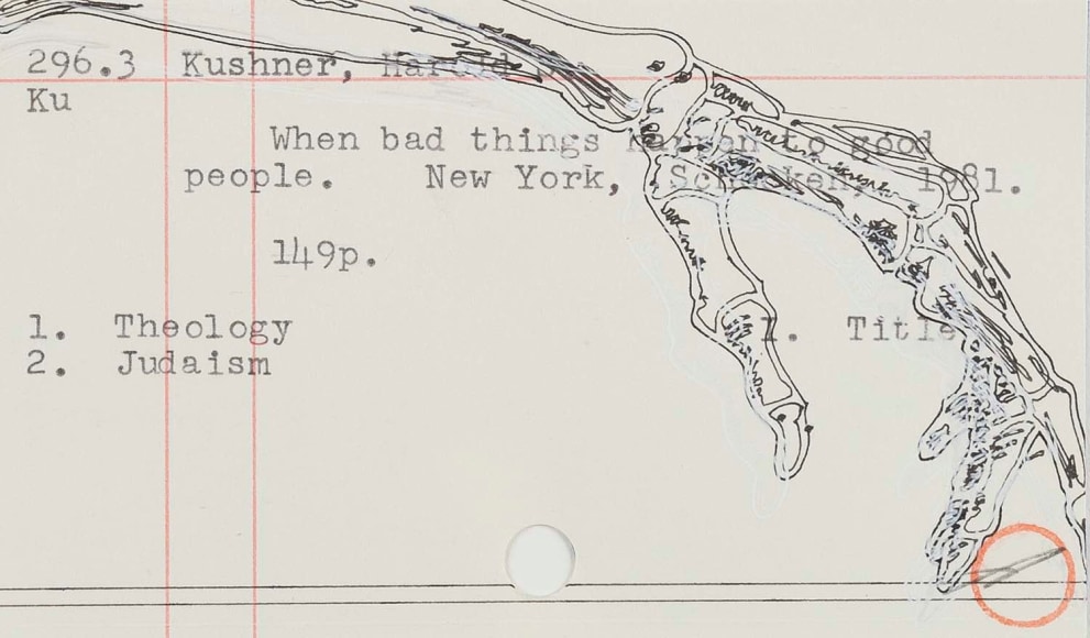 Weinstein then began to stamp them with his own imagery: fish, waves, blood splatters, skeletons and plants, like a librarian using an encrypted form of the card catalogue to create an allegorical system.