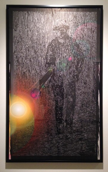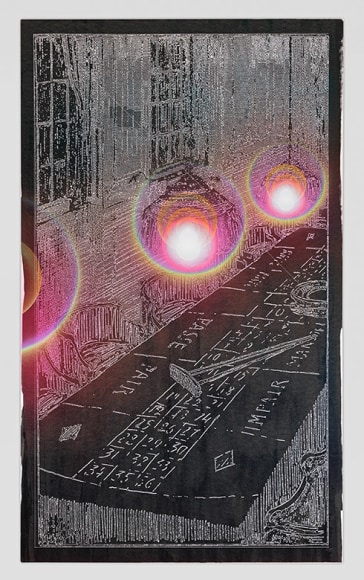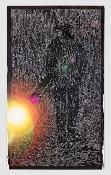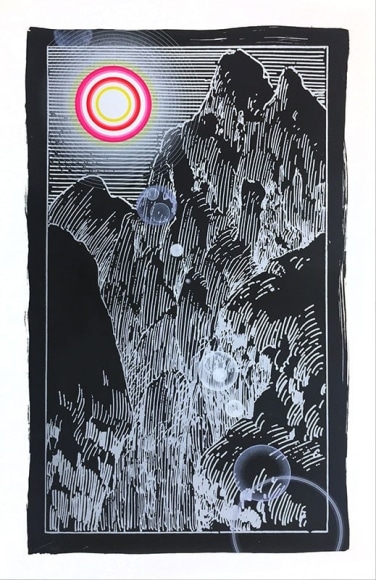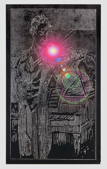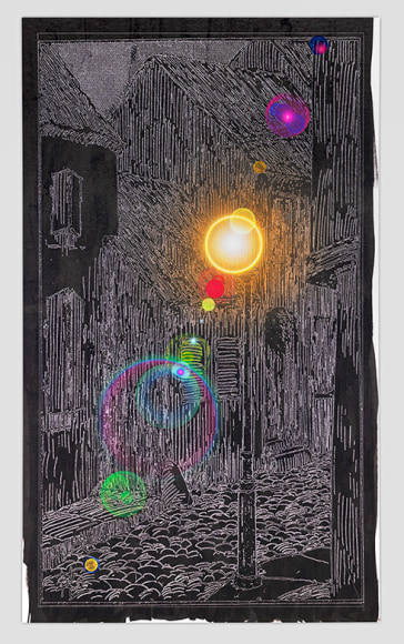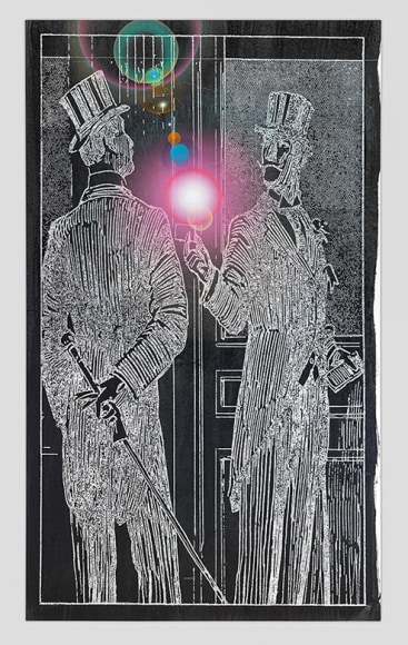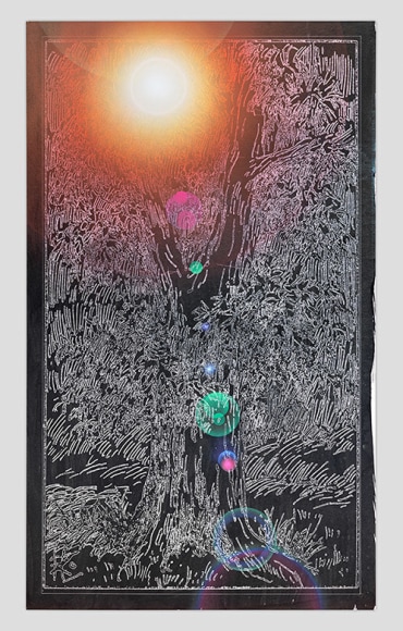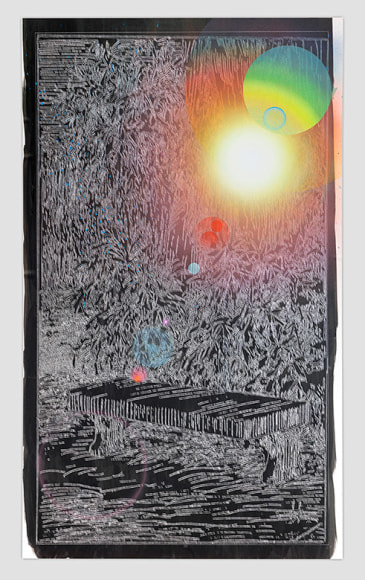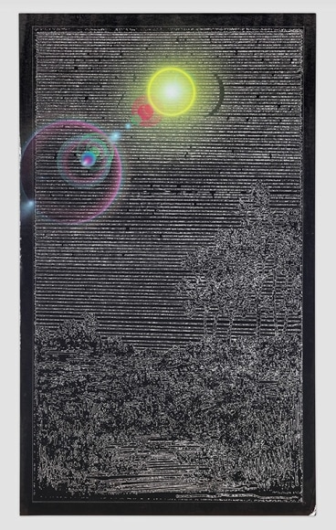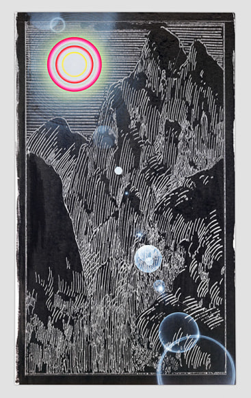 In his series of drawings, Life On Other Planets, Weinstein has taken a selection of these Roussel/Zo illustrations as source material. He has altered, stretched, edited and then drawn them using japanese sumi ink and pen on watercolor paper. Into each drawing he has inserted painted solar flares that fill the blankness and stillness of these drawings with illuminations, special effects; a glimpse of a double moon from another planet. Weinstein's drawings, which utilize painting, airbrush, hand drawing, as well as computer vectoring, are odes to Roussel's prescience in testing the boundaries of one's mind by looking at it as a silent machine. Like Roussel, Weinstein begins with selected data (the drawings) which he outputs as new cultural artifacts using his hand/machine techniques. Having opted to get a degree in Art History and not Studio Art, Weinstein's process has always been to select moments from cultural history and, instead of re-representing them or appropriating them, he wholly absorbs them and transforms them into something new until the original content, or data, is unrecognizable.