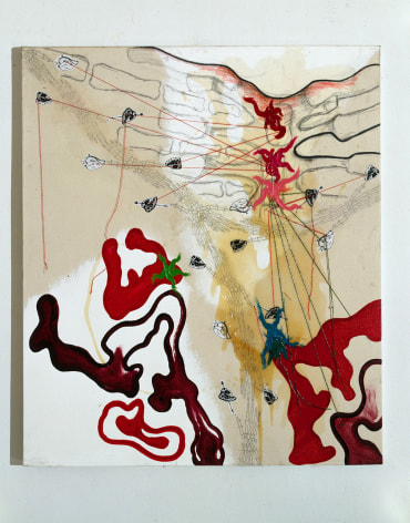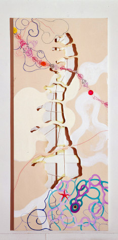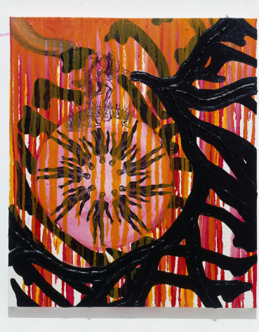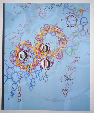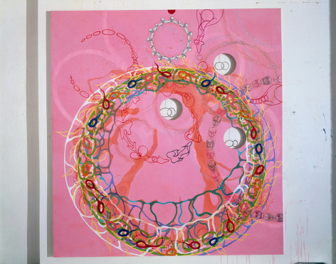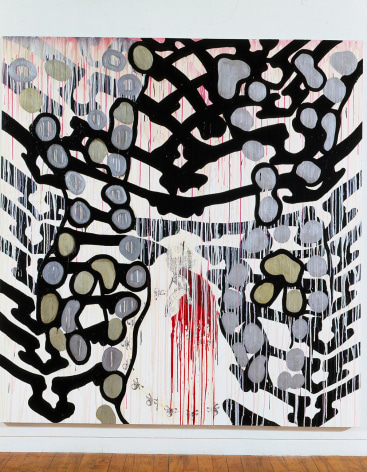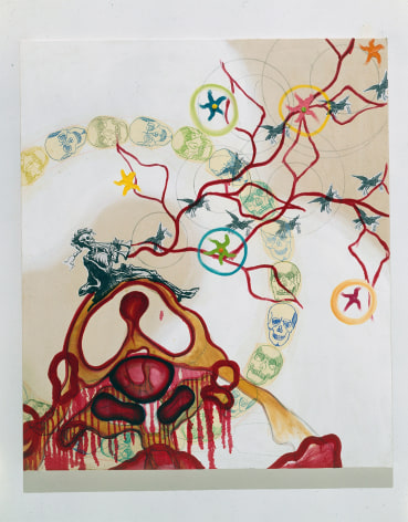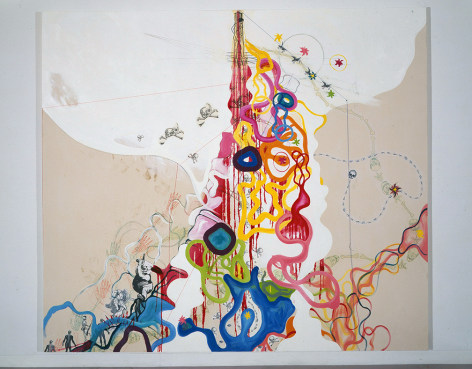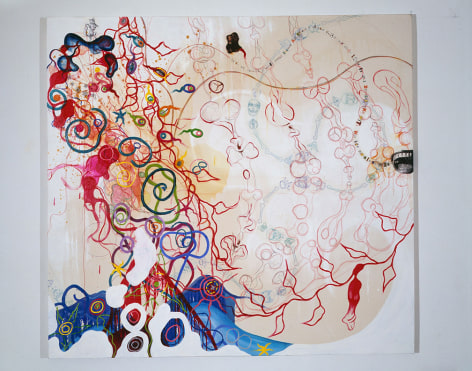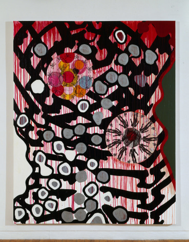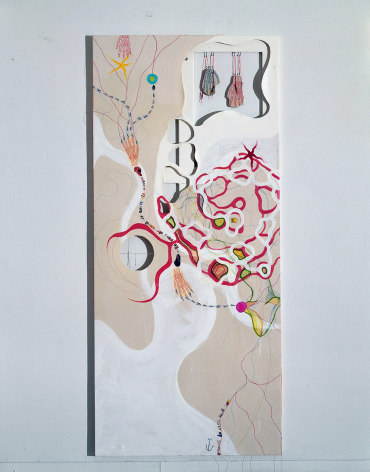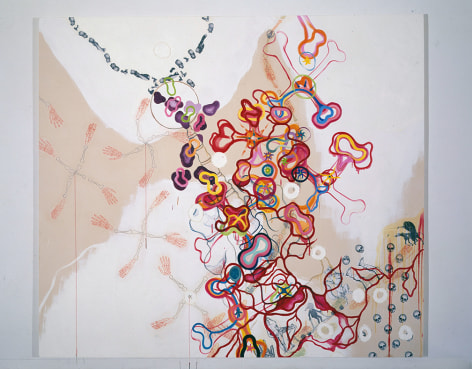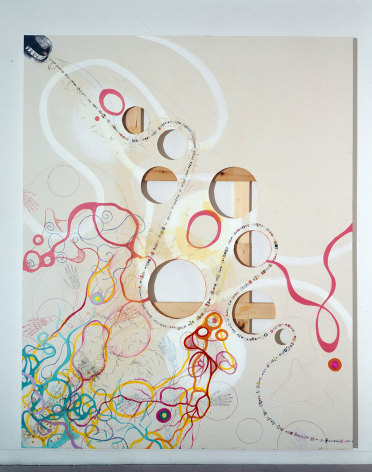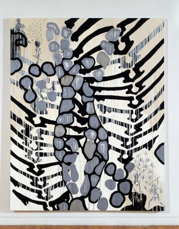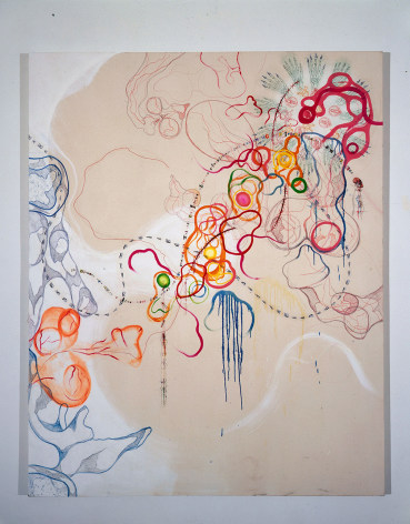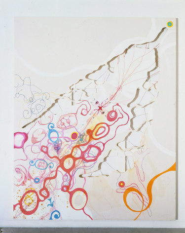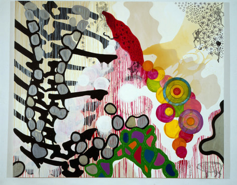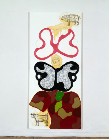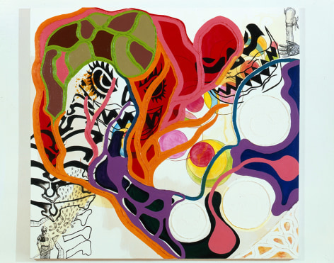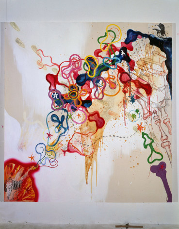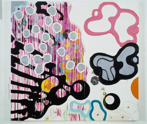 Similarly, in Weinstein’s paintings, each thing tends to become a cruder, more blatant, yet somehow more immediately enticing and legible version of itself: the “painterliness” of impasto is signified by circular elements built up to the point where they become a kind of relief; “process” is there as the all-over drip-qua-idea-drippiness every younger abstract painter seems obliged to acknowledge lately; “representation” is represented by decals of found imagery collaged onto the canvas; even the notion “showing at Sonnabend” seems signaled by a use of organic form that often reads as a send-up of Terry Winters by way of Carroll Dunham cartooniness pushed to a degree that even Dunham would never countenance.
