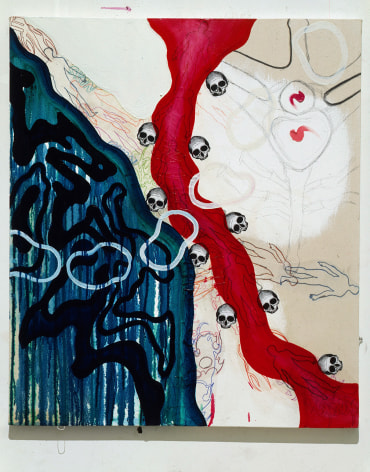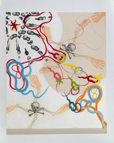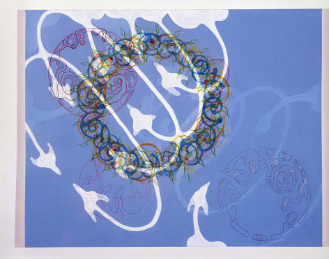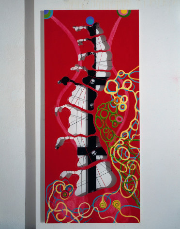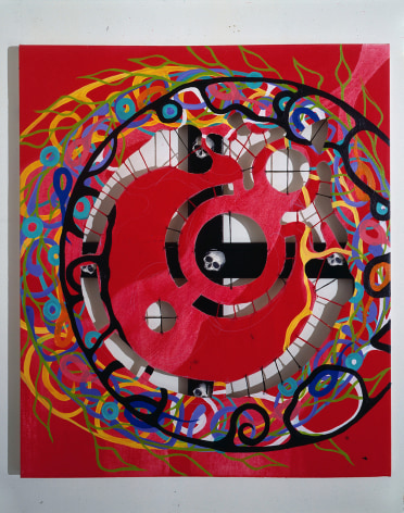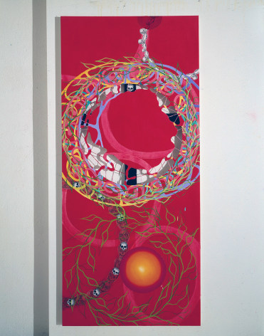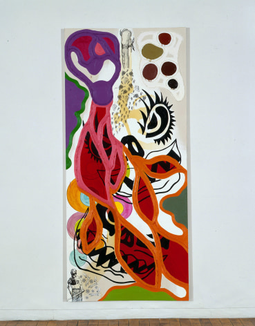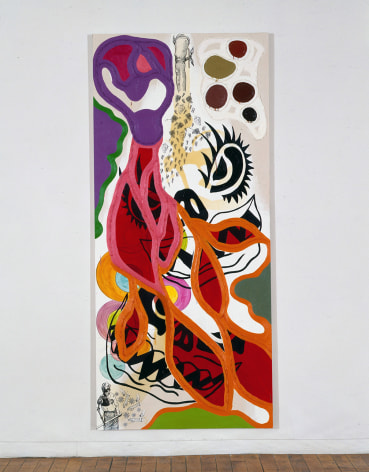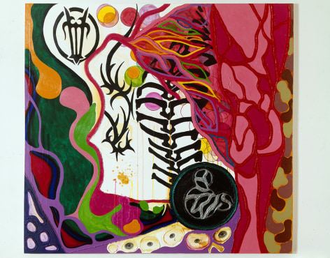 Not that there isn’t a serious side to all this. Certainly, as with so much of today’s art, there’s the shadow of AIDS. The “abstract” imagery of proliferating cells, bones, and organs mixes for the first time in Weinstein’s work with a “representational” imagery in which skeletons and other symbols of death and disaster predominate. But it remains questionable how seriously we should take this seriousness: in As Long As I’ve Got a Face (all works 1992), for example, a skeleton banging a drum that hangs in front of his crotch is a mere Halloween version of the sex-and-death nexus, and tends as easily to undermine as to underscore the import of the swirls and eddies of abstract shape that are the main business of the picture. Sometimes, for mostly formal reasons, Weinstein’s contradictions only cancel each other out, but when, as in this case, they buoy each other up, the effect of volatility is strangely exhilarating.
