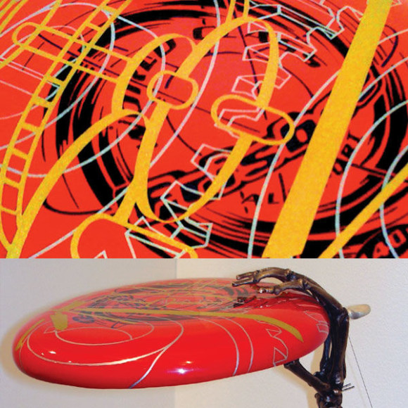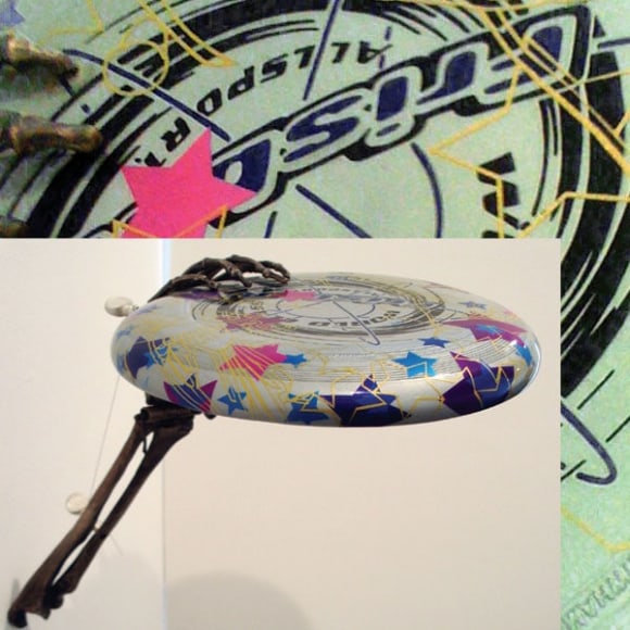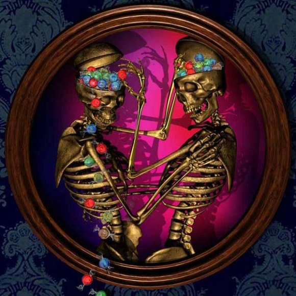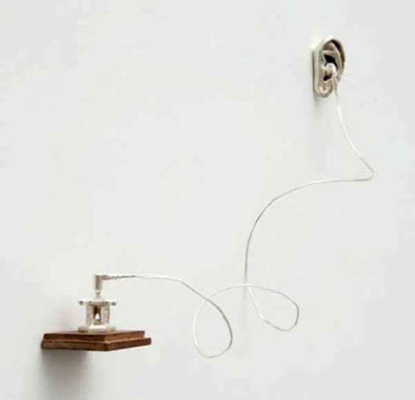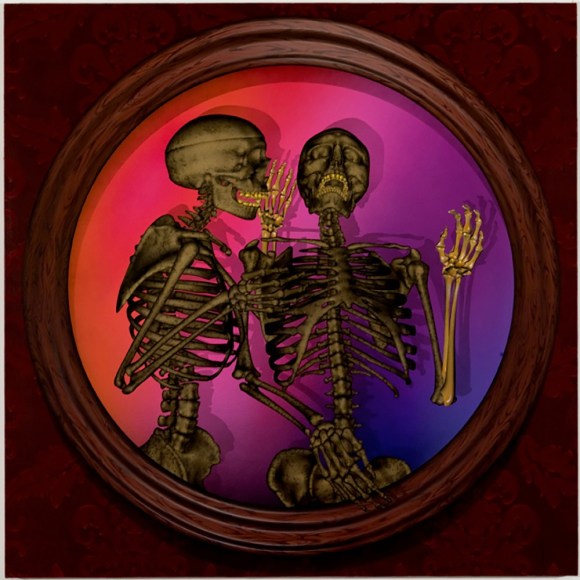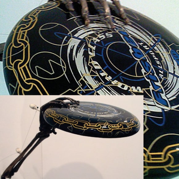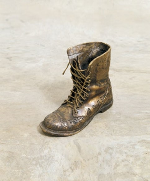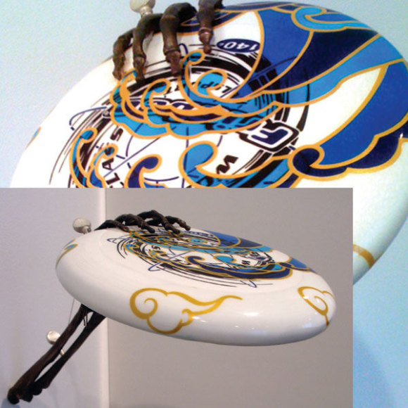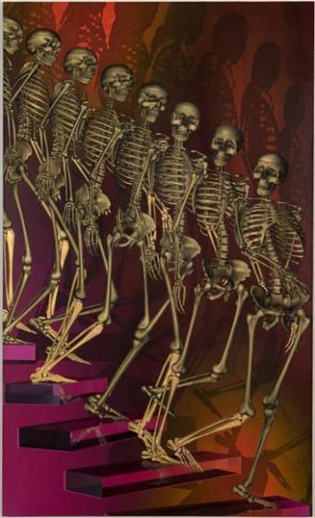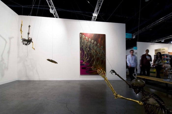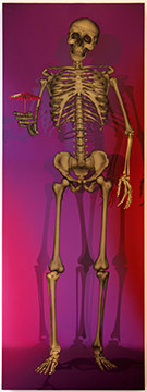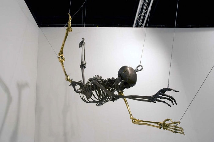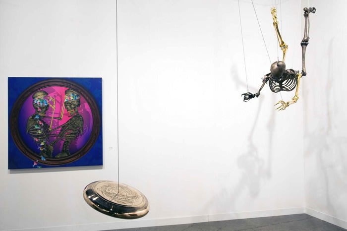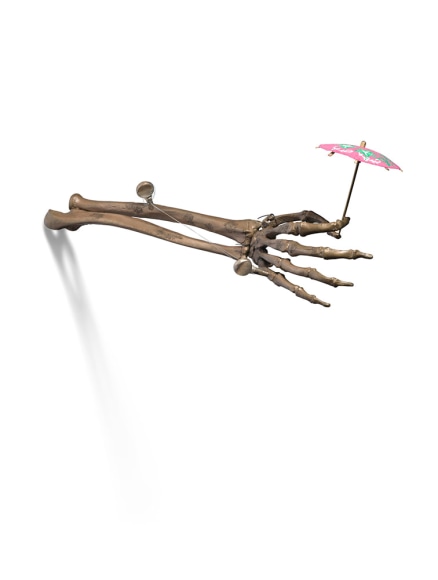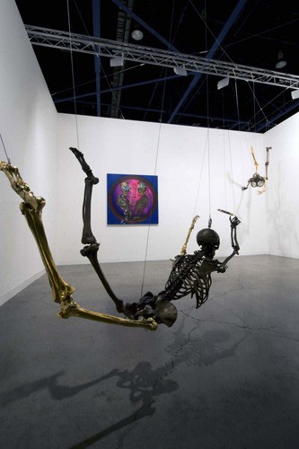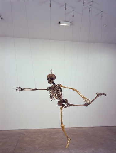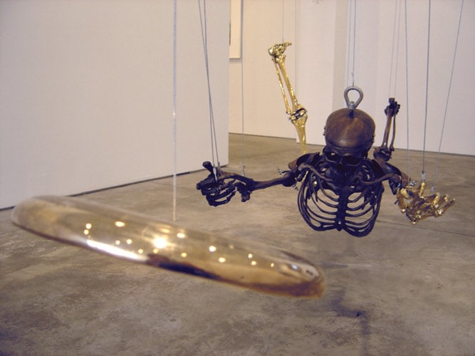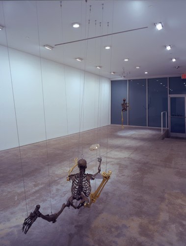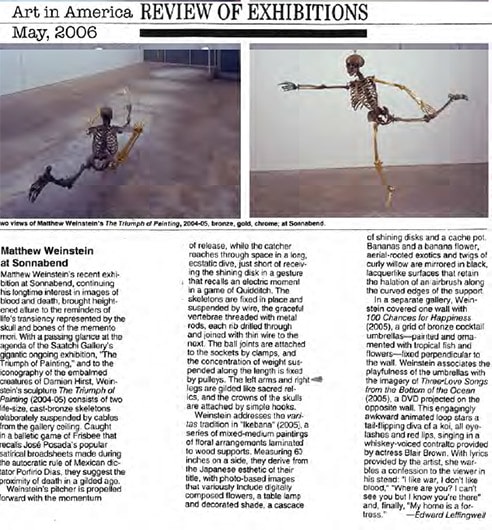 When an artist opens a show with an installation called The Triumph of Painting, 2004–2005, but includes no "proper" paintings, it's a bold step. When that installation consists of two "life"-size bronzed and gilded skeletons suspended, midair, playing Frisbee, that step becomes a brazen leap. Spanning a baffling array of media and motifs, Matthew Weinstein's latest solo show is a smart display of the artist's jocular mind and protean talent. Triumph plays on the eschatological premise of Charles Saatchi's (recently postponed) exhibition of the same name, wryly suggesting that such hubris is bad for one's health. In the next room hang three gorgeous "paintings" of flower arrangements from Weinstein's "Ikebana" series. Originally modeled in Maya, the design was then transferred to wood and detailed by an auto-body painter; the results—lacquered imbroglios of flowers, drink parasols, and transparent baubles—make for some menacing still lifes. Some of the show's brilliance is muddled by Three Love Songs From the Bottom of the Ocean, 2005, a sloppily animated three-dimensional Japanese Koi singing torch songs in the next room, but projected opposite one-hundred painted bronze cocktail umbrellas (100 Chances for Happiness, 2005), the piece develops a maudlin desperation that salvages its Pixar overtones. Weinstein delights in anchoring fragile tokens of exchange (Frisbees, cocktail umbrellas, flowers, and love songs) to more permanent materials (metal, walls, or the bottom of the ocean), an anxious practice that reveals either an acute case of worldly codependence or a firm faith in the value of reciprocity.