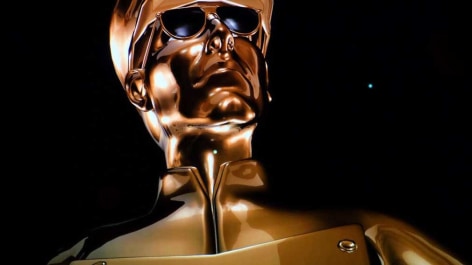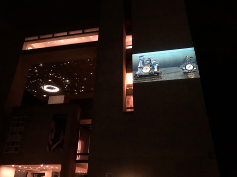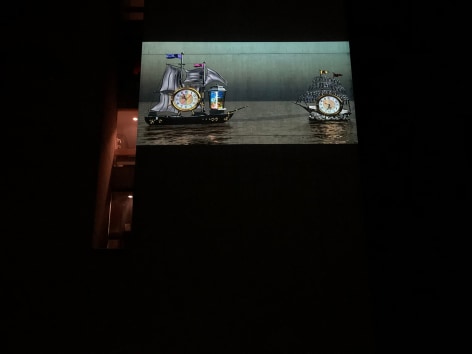 In Cruising, 1980, created in 2010, two chrome ships slowly pass each other on a calm and glassy sea. The vessels, modeled after items found in New York City’s Chinatown, sparkle and glow for each other as they pass. In the world of the film, familiar and inanimate objects interact sentiently. The title is a clue to the fact that that these ships are engaged in the action of sexual display, cruising; these ships have desire. This film, and other films of Weinstein’s that feature his animated talking pigs and fish, examine the enduring human craving for Animism. Our last vestiges of our pagan spiritual selves, when we shared spirits with our environments, are trapped in the Western entertainment spectacle of the talking animal and the anthropomorphic object. For Weinstein, profundity lurks in the things closest at hand, and often in the things we don’t take seriously. But if we had never divided ourselves from our environment, if we had never decided that the world is for us and not of us, we never would have destroyed our environment. Having lived and traveled widely in Japan and Nepal, Weinstein’s distinctly non Western perspective is evident in the aesthetics of and the philosophy that drives his work.