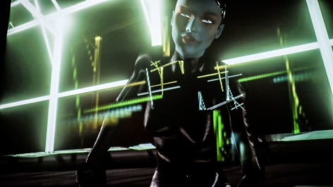 “I keep creating these closed mental microclimates in my work,” Weinstein notes. “Each film is one. Each painting is as well.” This is a near literal description of his newest interactive film, The Living End, 2017,shown for the first time in this exhibition, and created with the support of Cornell Tech. The film’s narrator is a beautiful woman who is an imaginative representation of Anna Kavan, an obscure avant garde British writer who has become one of Weinstein’s many female avatars . She is confined within a glowing enclosure in the negative space of the blank computer screen. She tells the story of the events of her life outside the enclosure, and how she ended up enclosed. Neither self pitying nor weak, she is like any person explaining their own complex attitude towards their own reality. Sensors in the gallery monitor biological data of visitors as they respond to the experience. This feedback subtly influences the narrator’s demeanor, but does not change the trajectory of her narrative. She is not for us to change. For Weinstein, the artwork is not a toy or an entertainment, it is an organism existing alongside of us in a world where the object and the subject are not as clearly divided as our Western religious and philosophical traditions dictate. Weinstein’s films bring a myriad of cultural and philosophical issues together, while remaining self-contained systems, a point beautifully expressed in the character’s conclusion, “Then one morning I woke up. The door to my room was gone.”